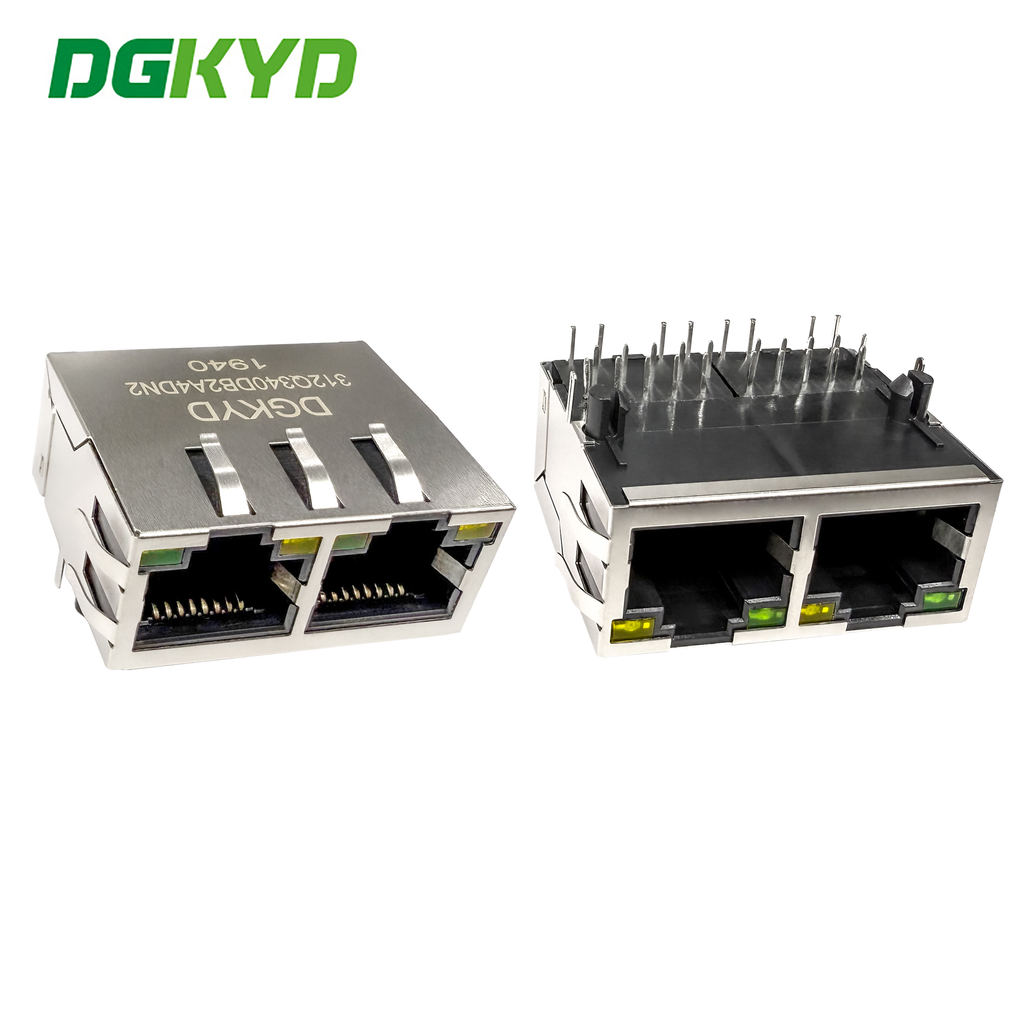 Konektor RJ45 dengan transformer terintegrasi 10G terintegrasi dengan cahaya dan pelindung DGKYD111Q594AB2A12DB1